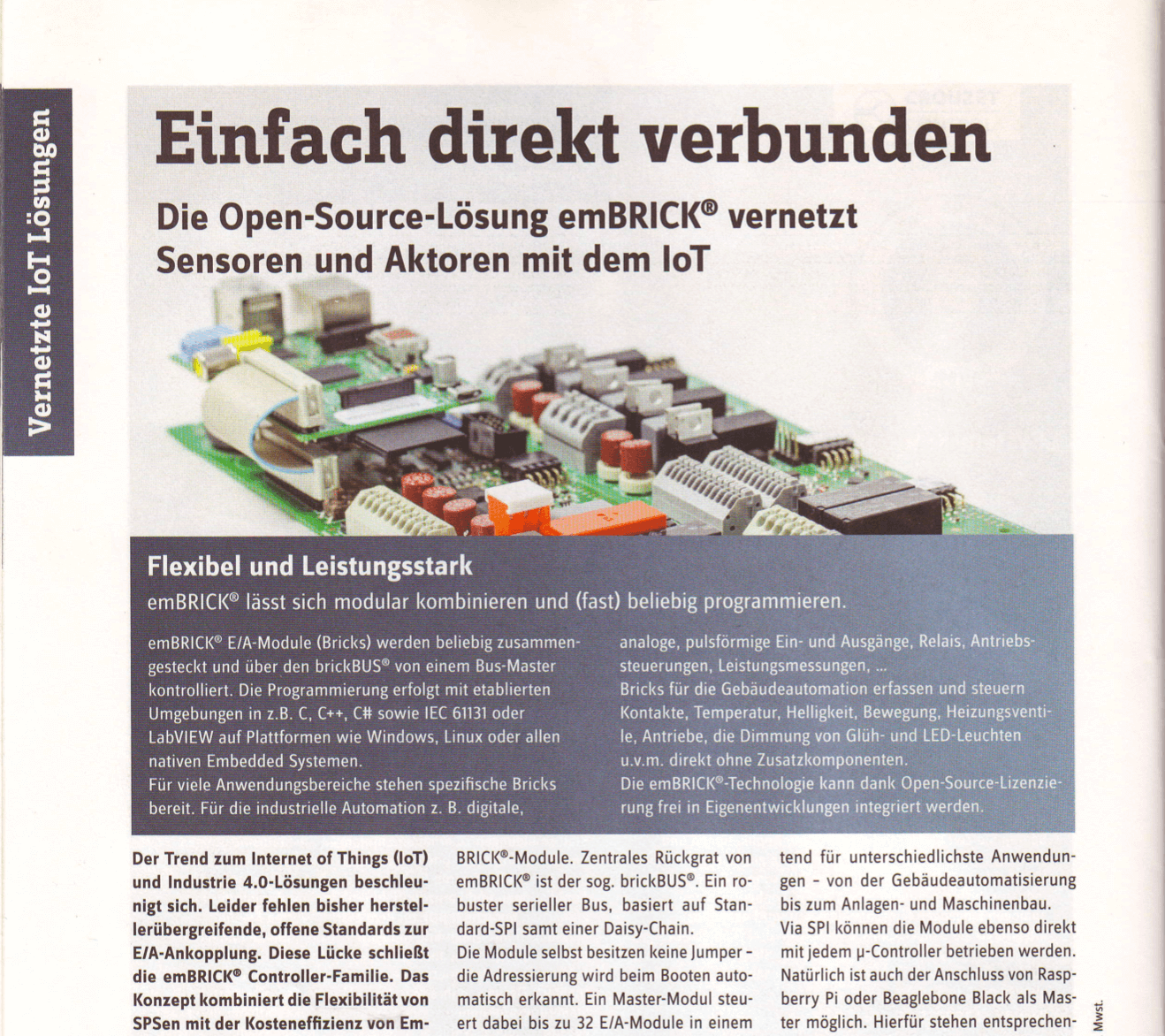 Nach vielen Anfragen präsentiert die emBRICK GmbH auf der SPS2019 erstmalig ihr gleichnamiges E/A-Hardwaresystem nun auch für CODESYS mit entsprechenden Bibliotheken. Kompakte "Out of the box" Industriesteuerungen, IoT-lösungen, Rapid Prototypes oder selbstentwickelte Bricks können nun auch mit der bekannten Programmierumgebung einfach realisiert werden. Für emBRICK, ein inzwischen seit mehr als drei Jahren erfolgreich eingeführtes, steckbares, modulares, embedded E/A-Frontendsystem, stehen mittlerweile über 70 verschiedene E/A-Module (sog. Bricks) wahlweise als Openframe oder in geschlossener Ausführung zur Verfügung. emBRICK ist ein offenes, modulares I/O-System zum direkten Anschluss von Sensoren und Aktoren. Durch die effiziente, kompakte open-frame Bauweise und einfache Ankopplung an jeden μC ist es eine einzigartige freie und universell einsetzbare embedded Steuerungslösung. Das System kann direkt via SPI oder mit einem Koppler via RS485, CAN oder Ethernet an jeden μC ...