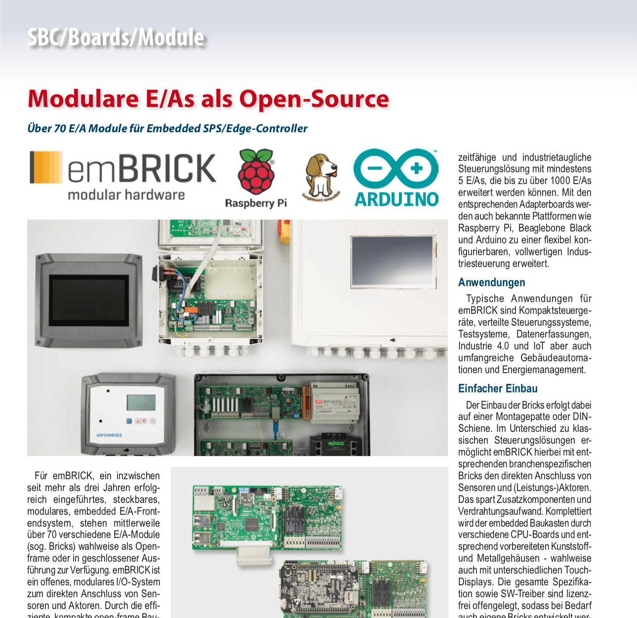 Gerne informieren wir Sie auf der embedded world zu folgenden Themen und Neuigkeiten: emBRICK® | Modulares E/A-System für Embedded-Steuergeräte/SPS, Edge-Controller, IoT, … - Open Source, extrem skalierbar (I/O, CPU, HMI, Housing) - viele Freiheitsgerade und unzählige Realisierungsmöglichkeiten - Über 100 Komponenten, darunter 70 E/A-Bricks und Komplettsyteme mit Gehäuse und Display Neu - Support und Evaluations-Kits für Rasberry-Pi, Arduino, Beaglebone-Black sowie MSVC, Labview, … - Robuste Fertigsysteme und Schaltschranklösungen „out oft he Box“ als schneller SPS-Ersatz - Zahlreiche neue Module/Bricks (Präzisionsmesstechnik, Testsysteme, ….) - viele Bricks nun auch als geschlossene Hutschienenlösung … oder schauen Sie einfach auf unser neues emBRICK Big-Picture und entdecken Sie die ganze Möglichkeiten von emBRICK auf einem Blick www.embrick.de. radCASE® | Modellbasiertes Software Entwicklungs-Tool - UML-basiert, Enterprise Architect kompatibel - Modellieren und Generieren von ... Serien-Code, HMI/GUI, ...