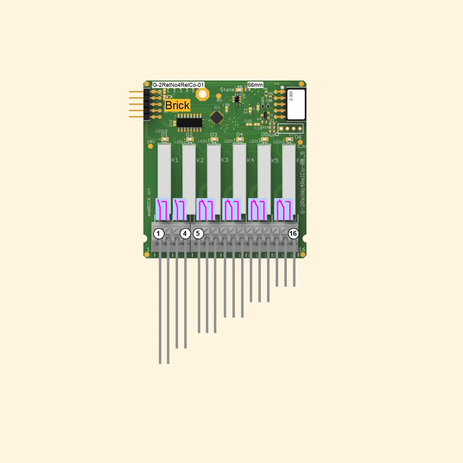 This Relay module includes six isolated Relays. Each can switch a current of max. 4A. The first two are closing contacts. The other four are changeover contacts. The state of each relay is visualized by an LED.