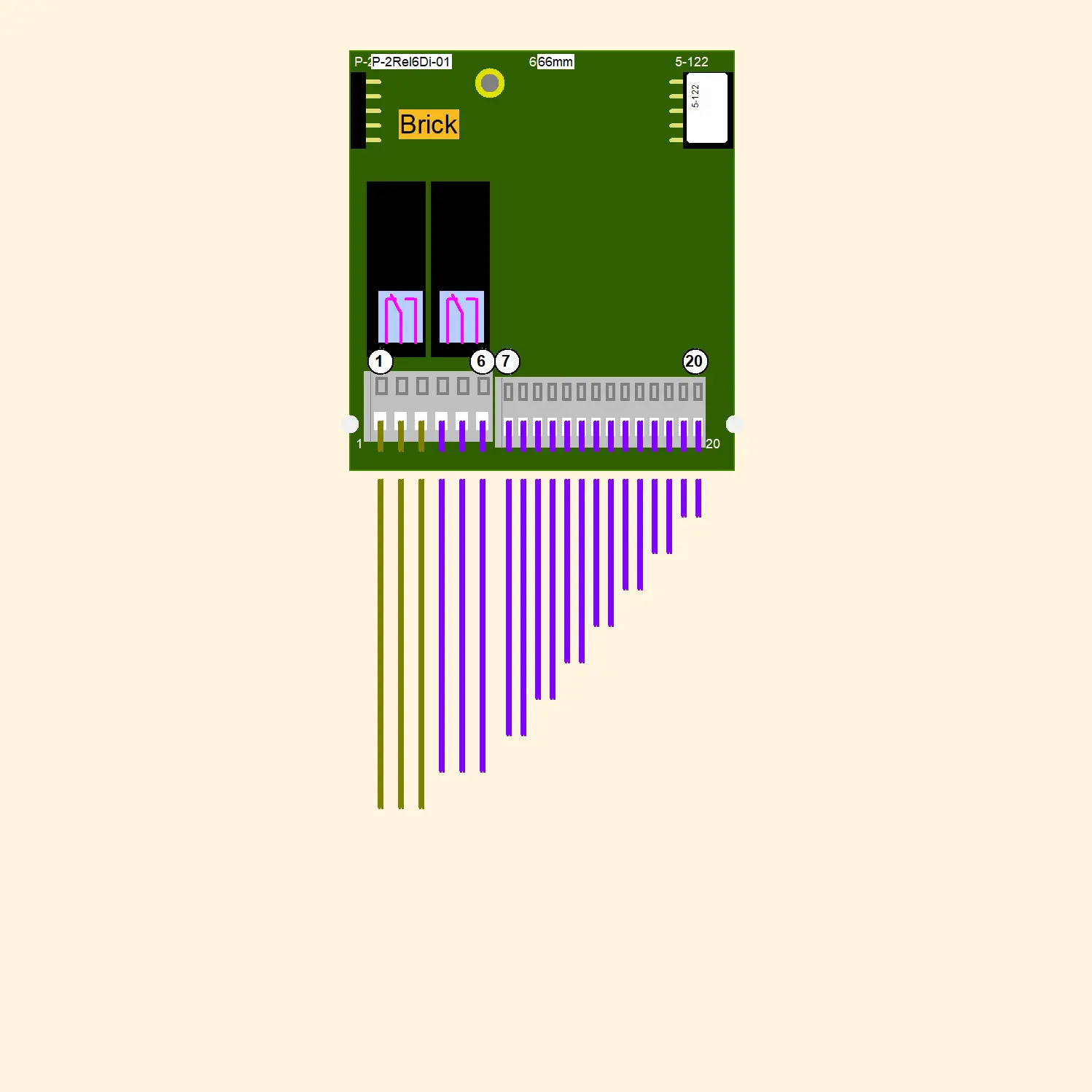 The Module includes two potential free relays each for max. 5A and six digital inputs. These inputs need an external closing to ground.