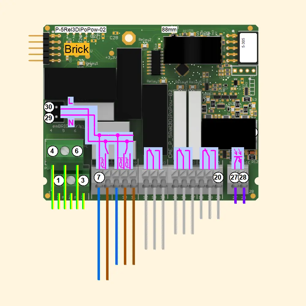 Four other relays are able to supply up to 230V. 2 of these are closing and the other 2 are switch-over. Each of the supplying relay can switch up to 5A. The max. permant sum current over the supply outputs is 5A.