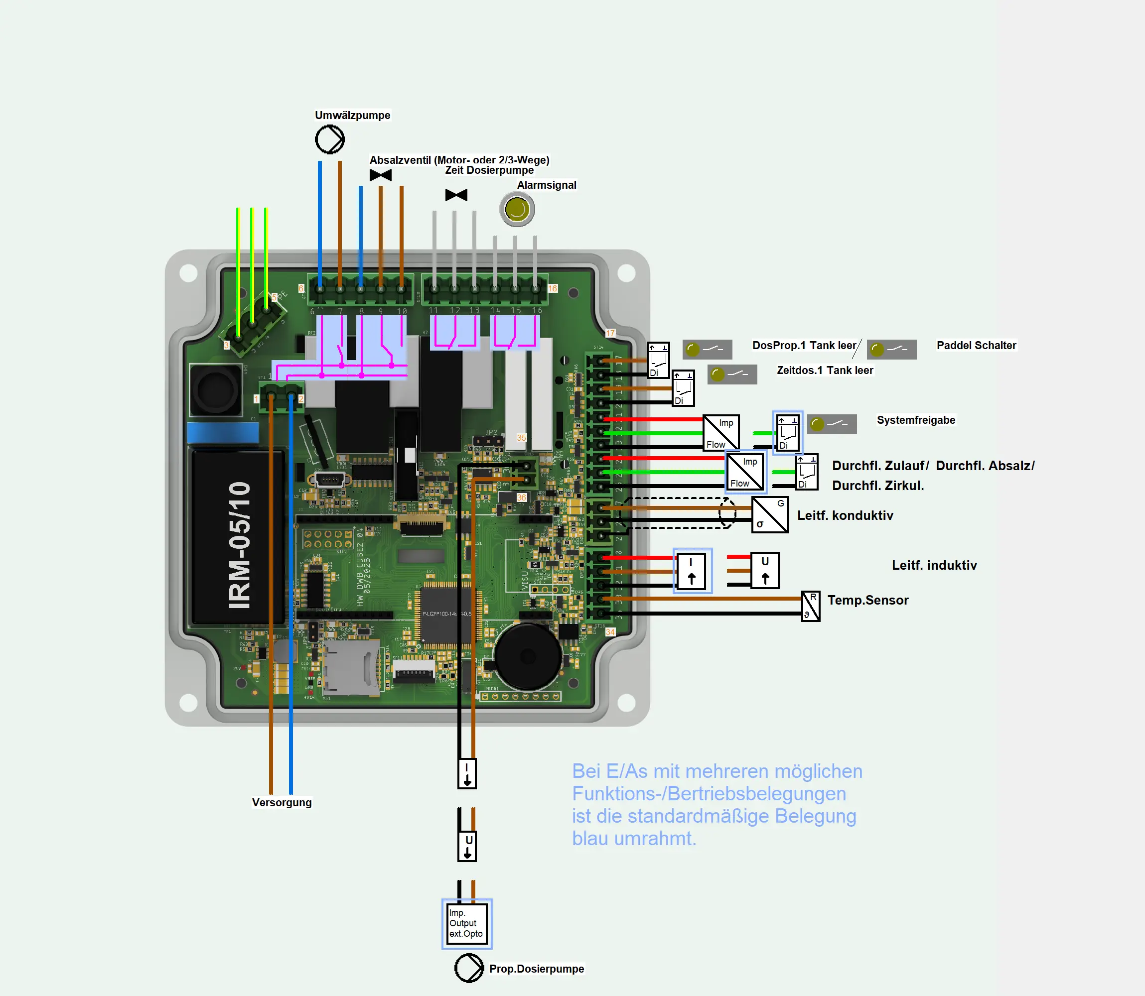 • anschließbarer konduktiver 2-Eletronden- LF-Sensor mit temperaturkompensierter Anzeige und Auswertung der Leitfähigkeit. Plausibilitätsprüfungen zur Erkennung von Sensor- und Kabeldefekten